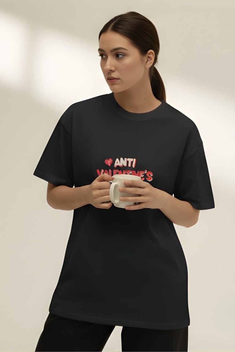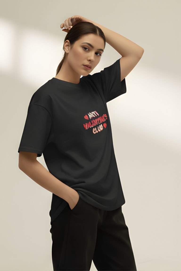 The VASTRNOVA Anti-Valentine’s Club Oversized T-Shirt is made for those who choose self-love, sarcasm, and comfort over clichés.