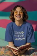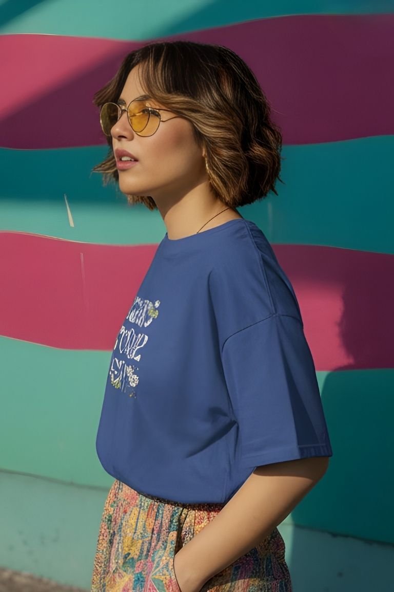 Crafted from premium breathable cotton, it offers a relaxed oversized fit that keeps you comfortable while adding a stylish, carefree vibe. The rich blue shade pairs beautifully with the soft artwork, making it the perfect go-to for sunny days, creative moods, or anytime you’re ready to make the day unforgettable.