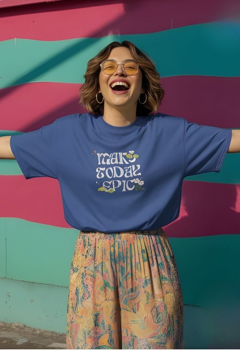 Start your day with pure positivity in the VASTRNOVA “Make Today Epic” Motivational Tee — a cheerful, soul-boosting piece designed to inspire. Featuring retro-style typography adorned with tiny floral and celestial motifs, this tee radiates joy and encourages you to embrace every moment with enthusiasm.
