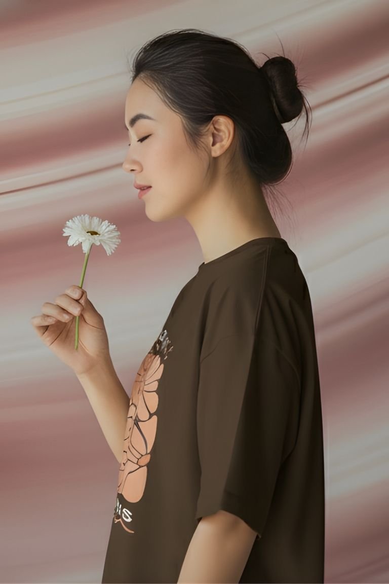 Crafted from premium soft cotton, it offers a relaxed oversized fit with gentle drape — perfect for everyday comfort and feel-good style. The earthy brown base paired with peach floral artwork creates a calming, aesthetic vibe ideal for casual outings, cozy days, or mindful styling.
