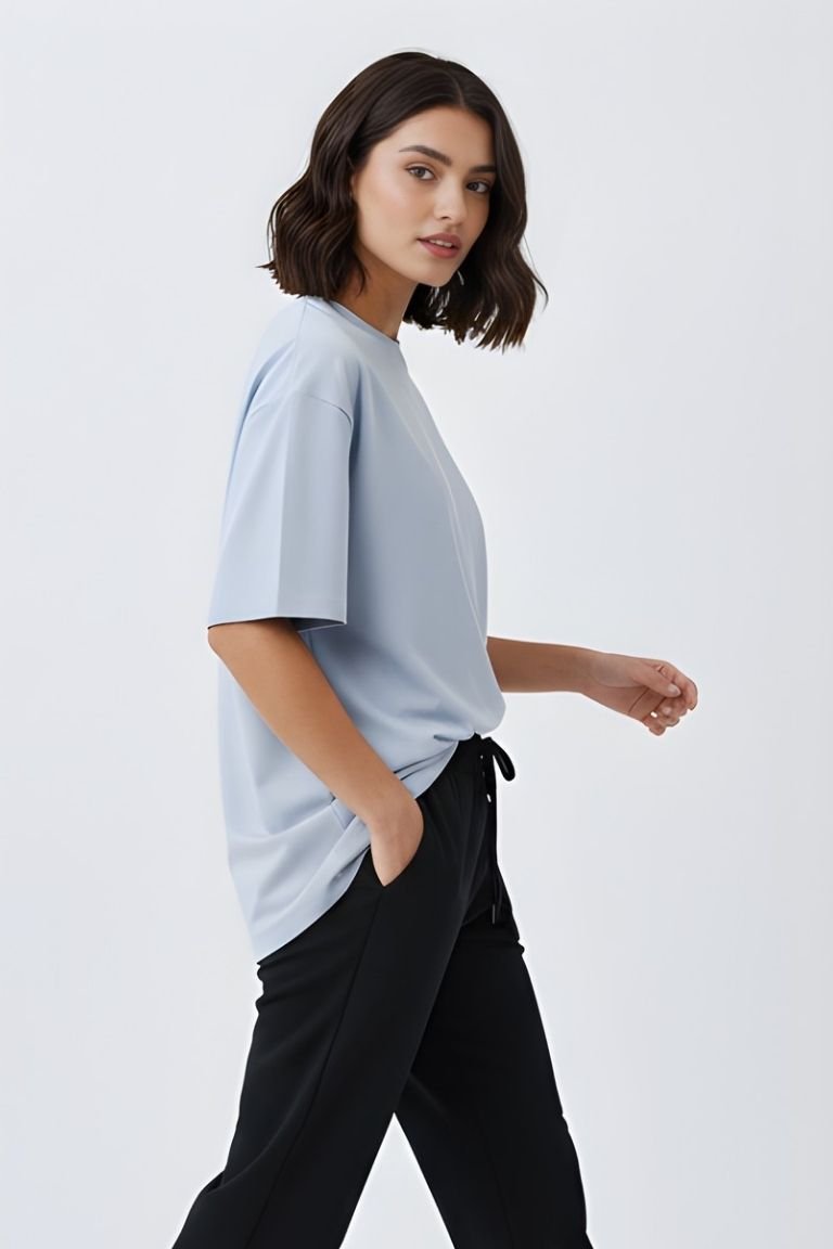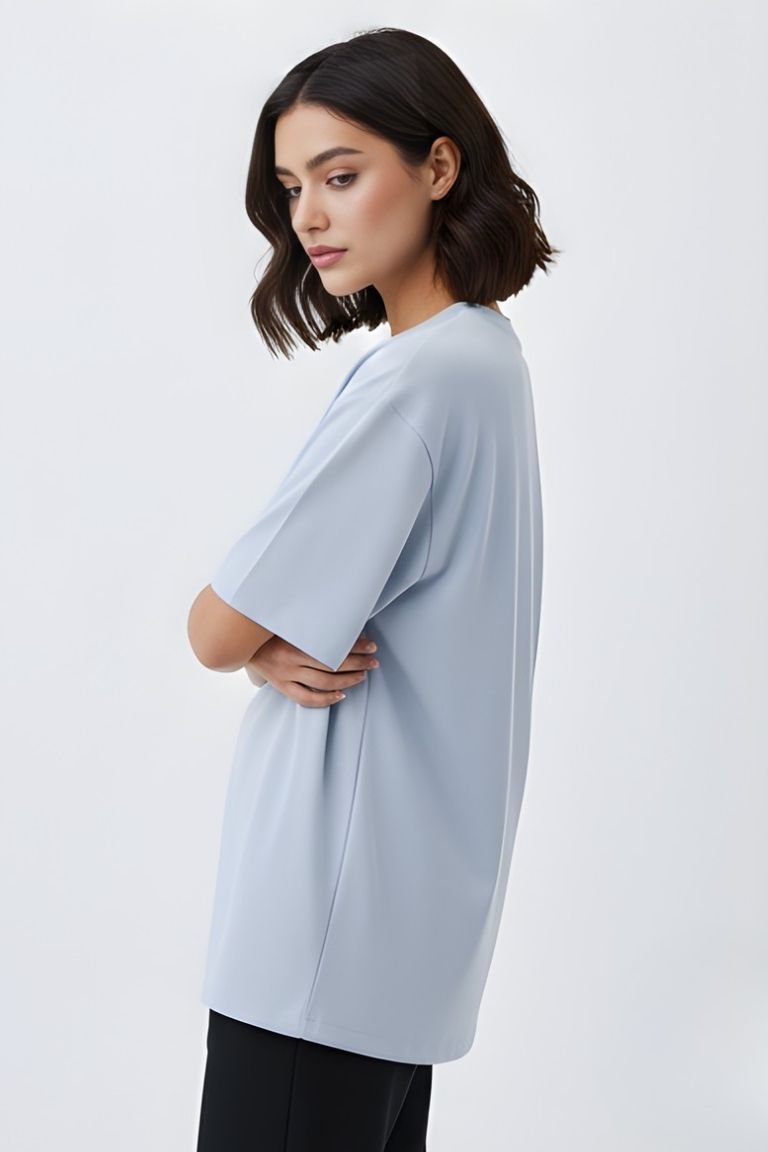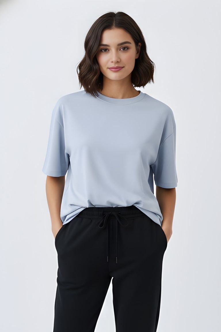 The VASTRNOVA Sky Ease Oversized T-Shirt is designed for modern comfort with a refined minimalist feel. Rendered in a calming pastel blue, this tee brings a light, airy aesthetic that transitions seamlessly from casual days to relaxed evenings.